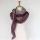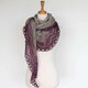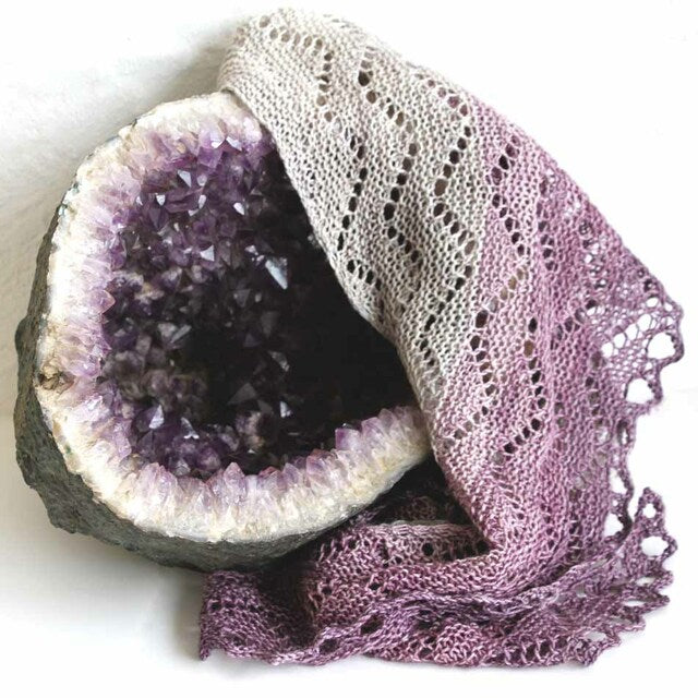 When light hits prism-like quartz crystals, the colours that are refracted are many and varied. Inspired by the variations of colour found in amethyst crystals. With yarn and size options ranging from a large five-colour gradient crescent to a smaller shawl composed of one solid colour with a contrast edging of the same modern geometric lace, there is a version of Allira that will best reflect the light that you want to be seen in.