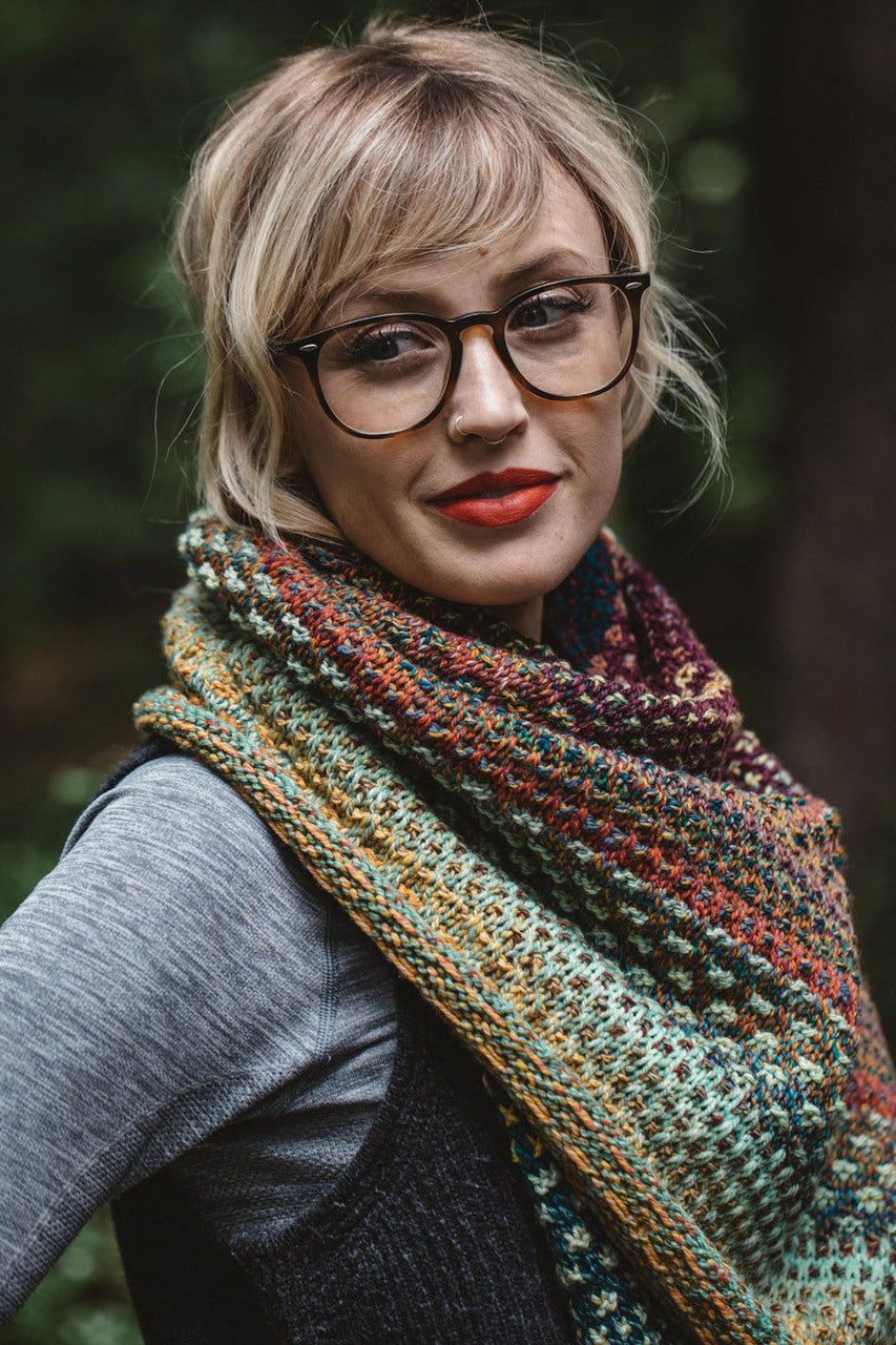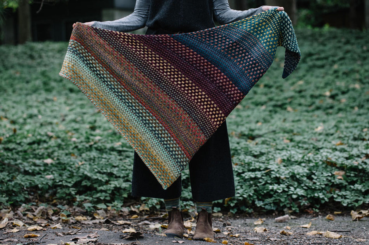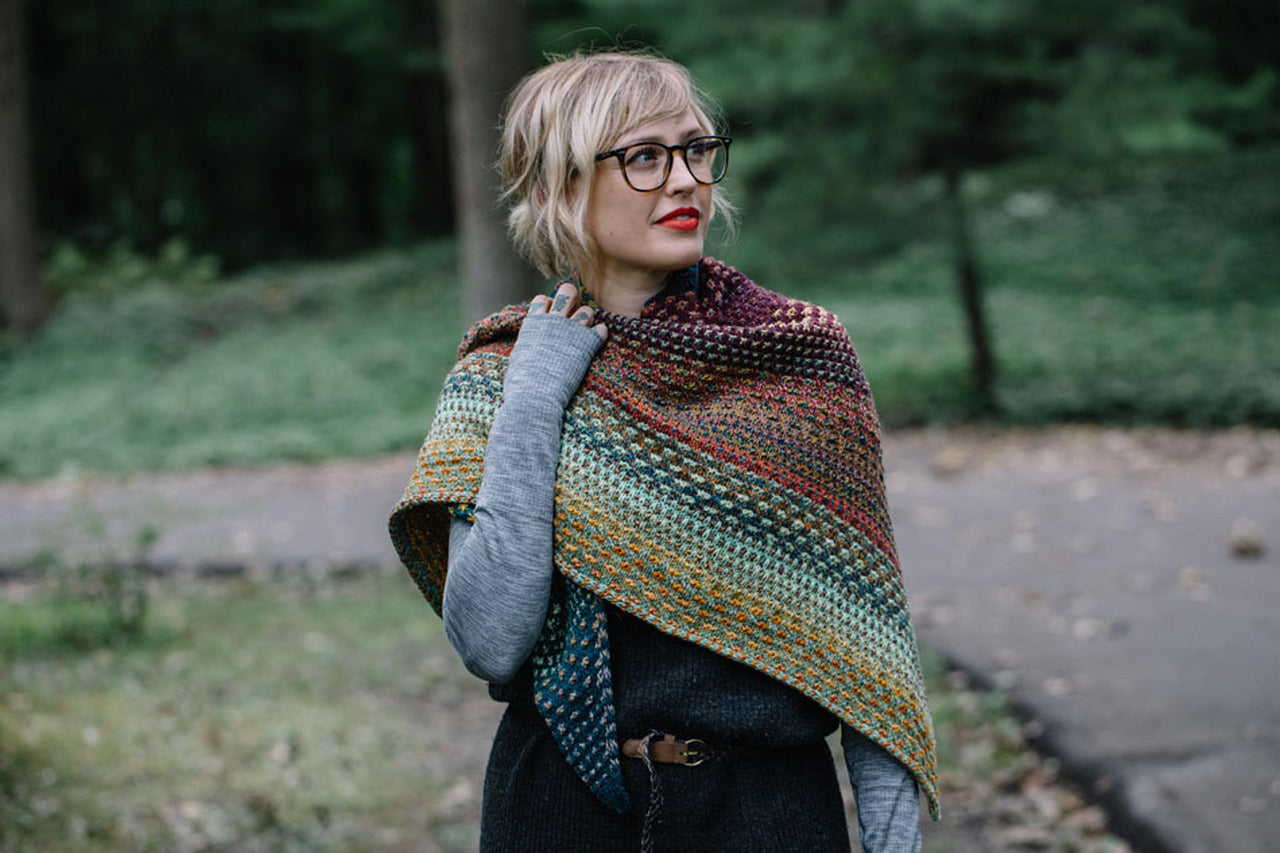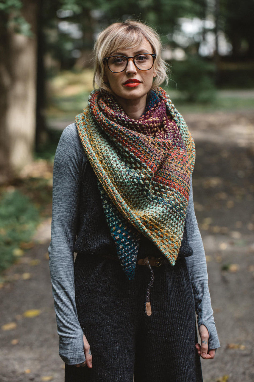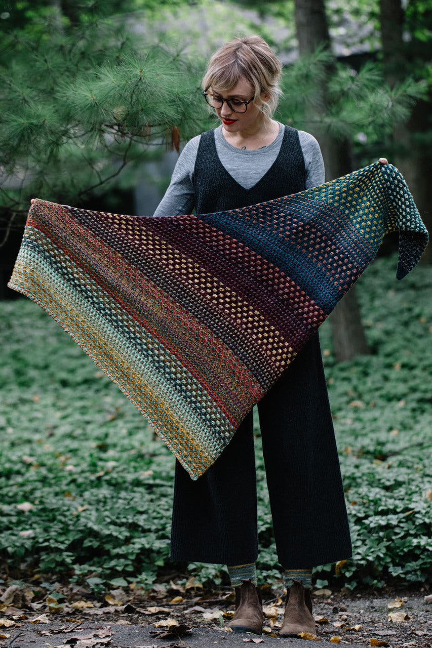 Short Description: Nightshift by Drea Renee Knits. Mosaic, multi color asymmetrical triangle shawl.